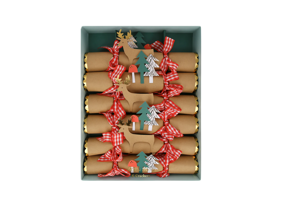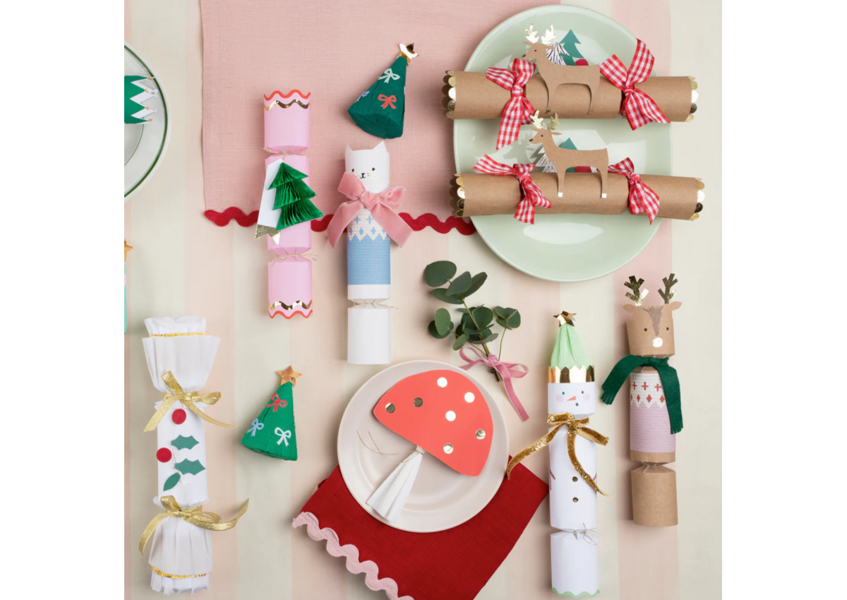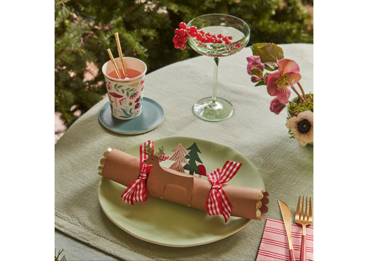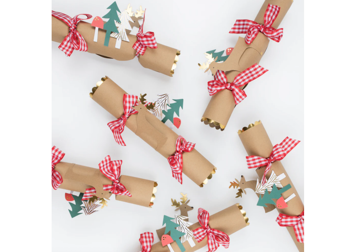 Why have plain crackers when you can these with outstanding details? They're beautifully made from kraft paper, with gingham ribbons and woodland flora and fauna 3D details – perfect if you want to bring the beauty of nature to your party table. And, they each contain a fun 'Guess Who?' Christmas antler headband with cards – ideal to play during or after your meal for lots of festive cheer.