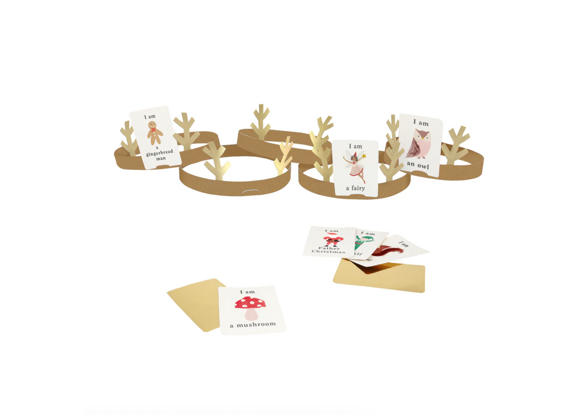 - Each cracker contains a joke; a paper reindeer antler headband in a different color, with a gold paperclip to secure it around the head; and 2 'Guess who?' cards with shiny gold foil on the reverse